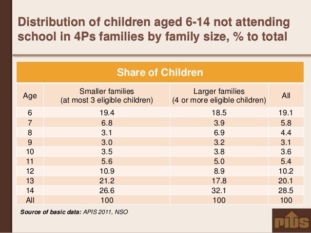 41. 41. Distribution of children aged 6-14 not attending school in 4Ps families by family size, % to total Share of Children Age Smaller families (at most 3 eligible children) Larger families (4 or more eligible children) All 6 19.4 18.5 19.1 7 6.8 3.9 5.8 8 3.1 6.9 4.4 9 3.0 3.2 3.1 10 3.5 3.8 3.6 11 5.6 5.0 5.4 12 10.9 8.9 10.2 13 21.2 17.8 20.1 14 26.6 32.1 28.5 All 100 100 100 Source of basic data: APIS 2011, NSO