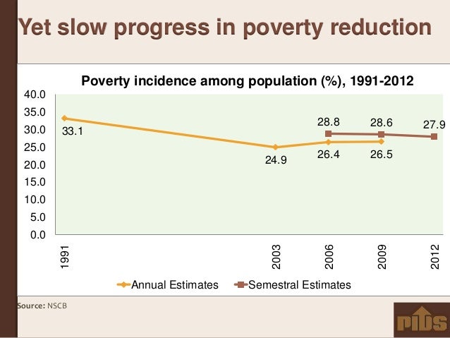 4. 4. 33.1 24.9 26.4 26.5 28.8 28.6 27.9 0.0 5.0 10.0 15.0 20.0 25.0 30.0 35.0 40.0 1991 2003 2006 2009 2012 Poverty incidence among population (%), 1991-2012 Annual Estimates Semestral Estimates Source: NSCB Yet slow progress in poverty reduction