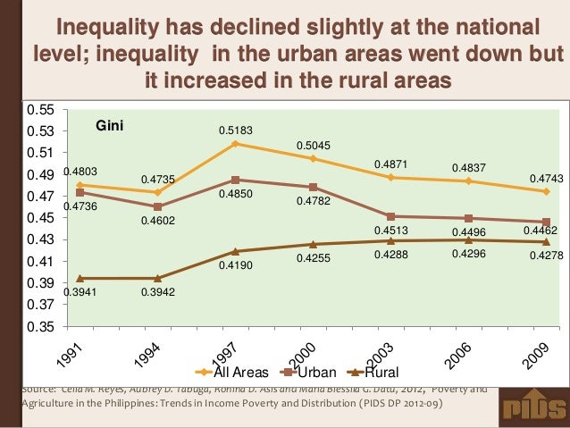 5. 5. Inequality has declined slightly at the national level; inequality in the urban areas went down but it increased in the rural areas Source: Celia M. Reyes, Aubrey D. Tabuga, Ronina D. Asis and Maria Blessila G. Datu, 2012, Poverty and Agriculture in the Philippines: Trends in Income Poverty and Distribution (PIDS DP 2012-09) 0.4803 0.4735 0.5183 0.5045 0.4871 0.4837 0.4743 0.4736 0.4602 0.4850 0.4782 0.4513 0.4496 0.4462 0.3941 0.3942 0.4190 0.4255 0.4288 0.4296 0.4278 0.35 0.37 0.39 0.41 0.43 0.45 0.47 0.49 0.51 0.53 0.55 All Areas Urban Rural Gini
