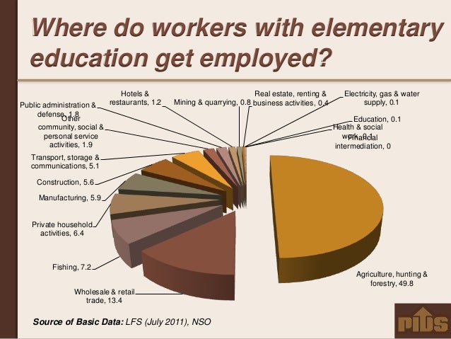 7. 7. Where do workers with elementary education get employed? Agriculture, hunting & forestry, 49.8 Wholesale & retail trade, 13.4 Fishing, 7.2 Private household activities, 6.4 Manufacturing, 5.9 Construction, 5.6 Transport, storage & communications, 5.1 Other community, social & personal service activities, 1.9 Public administration & defense, 1.8 Hotels & restaurants, 1.2 Mining & quarrying, 0.8 Real estate, renting & business activities, 0.4 Electricity, gas & water supply, 0.1 Education, 0.1 Health & social work, 0.1Financial intermediation, 0 Source of Basic Data: LFS (July 2011), NSO