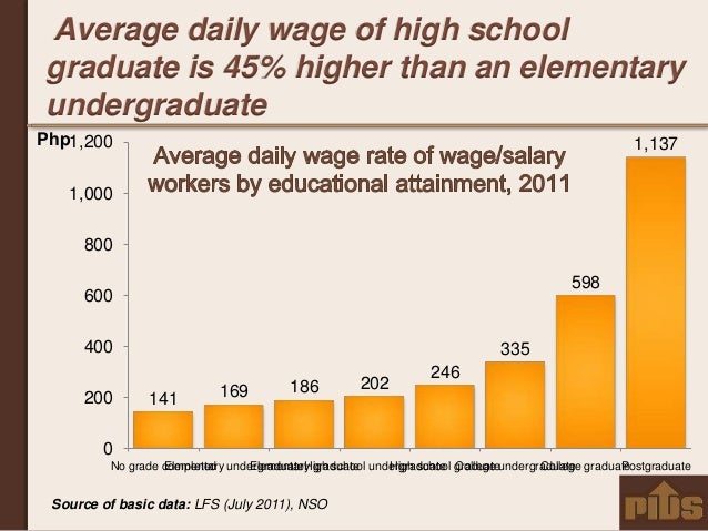 8. 8. Average daily wage of high school graduate is 45% higher than an elementary undergraduate 141 169 186 202 246 335 598 1,137 0 200 400 600 800 1,000 1,200 No grade completedElementary undergraduateElementary graduateHigh school undergraduateHigh school graduateCollege undergraduateCollege graduatePostgraduate Php Source of basic data: LFS (July 2011), NSO