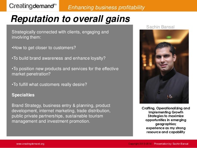 11. 11. Reputation to overall gains www.creatingdemand.org Copyright 2013-2014 Presentation by: Sachin Bansal Strategically connected with clients, engaging and involving them: •How to get closer to customers? •To build brand awareness and enhance loyalty? •To position new products and services for the effective market penetration? •To fulfill what customers really desire? Specialties Brand Strategy, business entry & planning, product development, internet marketing, trade distribution, public private partnerships, sustainable tourism management and investment promotion. Crafting, Operationalizing and Implementing Growth Strategies to maximize opportunities in emerging geographies; experience as my strong resource and capability Sachin Bansal Enhancing business profitability