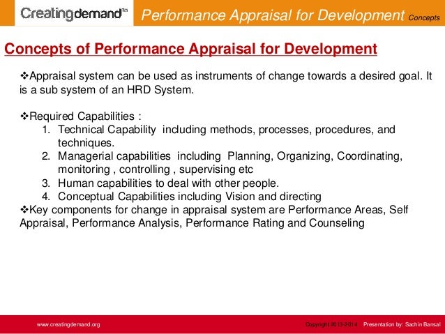 2. 2. Appraisal system can be used as instruments of change towards a desired goal. It is a sub system of an HRD System. Required Capabilities : 1. Technical Capability including methods, processes, procedures, and techniques. 2. Managerial capabilities including Planning, Organizing, Coordinating, monitoring , controlling , supervising etc 3. Human capabilities to deal with other people. 4. Conceptual Capabilities including Vision and directing Key components for change in appraisal system are Performance Areas, Self Appraisal, Performance Analysis, Performance Rating and Counseling Concepts of Performance Appraisal for Development www.creatingdemand.org Copyright 2013-2014 Presentation by: Sachin Bansal Performance Appraisal for Development Concepts