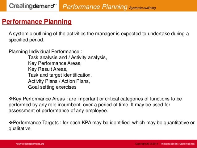 3. 3. A systemic outlining of the activities the manager is expected to undertake during a specified period. Planning Individual Performance : Task analysis and / Activity analysis, Key Performance Areas, Key Result Areas, Task and target identification, Activity Plans / Action Plans, Goal setting exercises Key Performance Areas : are important or critical categories of functions to be performed by any role incumbent, over a period of time. It may be used for assessment of performance of any employee. Performance Targets : for each KPA may be identified, which may be quantitative or qualitative Performance Planning www.creatingdemand.org Performance Planning Systemic outlining Copyright 2013-2014 Presentation by: Sachin Bansal