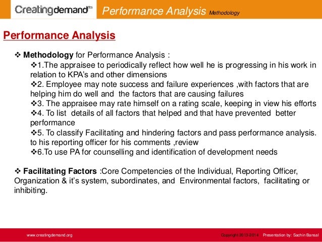 5. 5.  Methodology for Performance Analysis : 1.The appraisee to periodically reflect how well he is progressing in his work in relation to KPA’s and other dimensions 2. Employee may note success and failure experiences ,with factors that are helping him do well and the factors that are causing failures 3. The appraisee may rate himself on a rating scale, keeping in view his efforts 4. To list details of all factors that helped and that have prevented better performance 5. To classify Facilitating and hindering factors and pass performance analysis. to his reporting officer for his comments ,review 6.To use PA for counselling and identification of development needs  Facilitating Factors :Core Competencies of the Individual, Reporting Officer, Organization & it’s system, subordinates, and Environmental factors, facilitating or inhibiting. Performance Analysis www.creatingdemand.org Performance Analysis Methodology Copyright 2013-2014 Presentation by: Sachin Bansal