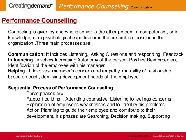 6. 6. Counseling is given by one who is senior to the other person- in competence , or in knowledge, or in psychological expertise or in the hierarchical position in the organization .Three main processes are Communication: It includes Listening,, Asking Questions and responding, Feedback Influencing : involves Increasing Autonomy of the person ,Positive Reinforcement, Identification of the employee with his manager Helping : It involves manager’s concern and empathy, mutuality of relationship based on trust ,Identifying development needs of the employee Sequential Process of Performance Counseling : Three phases are Rapport building : Attending counselee, Listening to feelings concerns Exploration of employees weaknesses and to identify his problems Action Planning to guide their employee and contribute to their development. It's phases are Searching, Decision making, Supporting Performance Counselling www.creatingdemand.org Performance Counselling Communication Copyright 2013-2014 Presentation by: Sachin Bansal