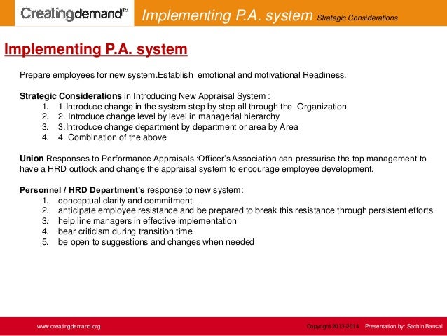 8. 8. Prepare employees for new system.Establish emotional and motivational Readiness. Strategic Considerations in Introducing New Appraisal System : 1. 1.Introduce change in the system step by step all through the Organization 2. 2. Introduce change level by level in managerial hierarchy 3. 3.Introduce change department by department or area by Area 4. 4. Combination of the above Union Responses to Performance Appraisals :Officer’s Association can pressurise the top management to have a HRD outlook and change the appraisal system to encourage employee development. Personnel / HRD Department’s response to new system: 1. conceptual clarity and commitment. 2. anticipate employee resistance and be prepared to break this resistance through persistent efforts 3. help line managers in effective implementation 4. bear criticism during transition time 5. be open to suggestions and changes when needed Implementing P.A. system www.creatingdemand.org Implementing P.A. system Strategic Considerations Copyright 2013-2014 Presentation by: Sachin Bansal