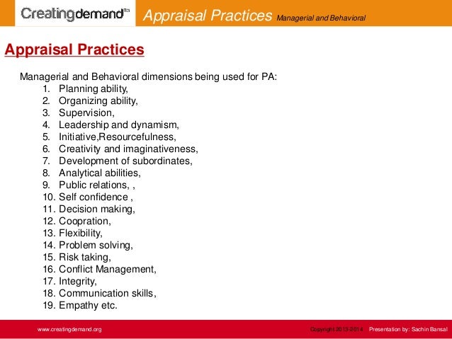 9. 9. Managerial and Behavioral dimensions being used for PA: 1. Planning ability, 2. Organizing ability, 3. Supervision, 4. Leadership and dynamism, 5. Initiative,Resourcefulness, 6. Creativity and imaginativeness, 7. Development of subordinates, 8. Analytical abilities, 9. Public relations, , 10. Self confidence , 11. Decision making, 12. Coopration, 13. Flexibility, 14. Problem solving, 15. Risk taking, 16. Conflict Management, 17. Integrity, 18. Communication skills, 19. Empathy etc. Appraisal Practices www.creatingdemand.org Appraisal Practices Managerial and Behavioral Copyright 2013-2014 Presentation by: Sachin Bansal