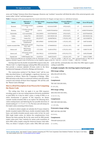3. 3. Nov Appro in Can Study Copyright © Jean-claude Perez 3/9 How to cite this article: Jean-claude P. Cancer, Quantum Computing and TP53 Tumor Suppressor Gene Mutations Prediction. Nov Appro in Can Study. 1(2). NACS.000507.2018. DOI: 10.31031/NACS.2018.01.000507 Volume 1 - Issue - 2 areas and “bridges” between these three languages. However, any “aesthete” researcher will think the table of the universal genetic code seems rather “ad hoc” and heterogeneous. Table 1: Example of Pi-mass projection fine-tuned selectivity for Oxygen average mass vs. individual isotopes. Nature Molecule or bioatom Average atomic mass Projection PPI(m) Pi-mass NPI(m) = N.Pi/10 Angle Error EPI (m,N) Bioatom C12 Carbon isotope 12 12.000000 0.01441631887 0 PI/10 (0°) 0° 0.01441631887 Bioatom C (Carbon average mass) 12.0111 0.0003703460363 0 PI/10 (0°) 0° 0.0003703460363 Nucleotide G (G nucleotide) 150.120453 0.01974469326 0 PI/10 (0°) 0° 0.01974469326 Codon Codon TCA 369.324471 0.01106361166 0 PI/10 (0°) 0° 0.01106361166 Codon Codon UCA 355.297477 0.6968708101 -1 PI/10 (-18°) -18° 0.0110300755 Codon Codon AGT (TCA complement) 409.349065 0.6930222208 -1 PI/10 (-18°) -18° 0.0071814862 double-stranded DNA DNA double strand: TCA + AGT 778.673536 0.7040858325 -1 PI/10 (-18°) -18° 0.0182450978 Amino acid PRO (Proline amino acid) 115.13263 0.6281423922 +2 PI/10 (+36°) +36° 0.0001761385 Amino acid LYS (Lysine amino acid) 146.190212 0.2553443926 +4 PI/10 (+72°) +72° 0.0012926688 Peptide link CONH Peptidic link 43.025224 0.6847234457 -1 PI/10 (-18°) -18° 0.0011172889 Notes: Projections PPI (m) are multiples of Pi:10. Example: 0.314... = 1Pi/10, 0.628... = 2Pi/10, etc... But, symmetrically vs. 0Pi/10, it appears another regular scale of attractors in the negative region of Pi/10: -1Pi/10 = 1-0.314 = 0.685..., -2Pi/10 = 1-0.628. Starting only from the double-stranded DNA sequence data, the “Master Code” is a digital language unifying DNA, RNA and proteins that provide a common alphabet (Pi-mass scale) to the three fundamental languages of Genetics, Biology and Genomics. The construction method of “the Master Code” will be now fully described below. It will highlight a significant discovery we summarize as follows: “Above the 3 languages of Biology - DNA, RNA and amino acids, there is a universal common code that unifies, connects and contains all these three languages”. We call this code the “Master Code of Biology.” Here is a Brief Description of our Process for Computing the Master Code The coding step: First, we apply it to any DNA sequence encoding a gene or any non-coding sequence (formerly mislabelled as junk DNA). So it may be either a gene, a contig of DNA, or an entire chromosome or genome. In this sequence, we always consider double-stranded DNA as we explore the following three codon reading frames and following the two possible directions of strand reading (3’ ==> 5’ or 5’ ==> 3’). The base unit will always be the triplet codon consisting of three bases. As shown in above sample, we calculate the Pi-mass related to double stranded triplets DNA bases, double stranded triplets RNA bases, and double-stranded pseudo amino acids. In fact, for each DNA single triplet codon, we deduce the complementary Crick Watson law bases pairing. We do the same work for RNA pseudo triplet codon pairs, then, similarly for amino acids translation of these DNA codon couples using the Universal Genetic Code table. Then, we obtain 3 samples of pairs codes: DNA, RNA and amino acids and this, systematically even when this DNA region is gene- coding or junk-DNA. A simple example: the starting region of prion gene DNA image coding: ATG CTG GTT CTC TTT... -1 -1 -1 0 0... Complement: TAC GAC CAA GAG AAA... 0 -1 0 -2 0... RNA image coding: AUG CUG CUU CUC UUU... -2 -2 -3 -1 -3... Complement: UAC GAC GAA GAG AAA... -1 -1 0 -2 0... Proteomics image coding: MET LEU VAL LEU PHE 4 3 3 4 3... Complement: TYR ASP GLN GLU LYS 2 -1 1 0 4...