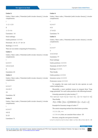 5. 5. Nov Appro in Can Study Copyright © Jean-claude Perez 5/9 How to cite this article: Jean-claude P. Cancer, Quantum Computing and TP53 Tumor Suppressor Gene Mutations Prediction. Nov Appro in Can Study. 1(2). NACS.000507.2018. DOI: 10.31031/NACS.2018.01.000507 Volume 1 - Issue - 2 Codon 5: Codon / Basic codes / Potentials (with circular closure) / circular complements: ! -1 -2 -1 -2 0 0 -1 -3 -4 -6 Cumulates: -14 Final rankings: Codon positions: 1 2 3 4 5 Potentials: -20 -21 -17 -18 -14 Rankings: 2 1 4 3 5 Then we run similar computing for Proteomics... Codon 1: Codon / Basic codes / Potentials (with circular closure) / circular complements: ! 6 2 4 4 7 6 8 12 16 23 0 Cumulates: 65 Codon 2: Codon / Basic codes / Potentials (with circular closure) / circular complements: ! 6 2 4 4 7 2 6 10 17 23 Cumulates: 58 Codon 3: Codon / Basic codes / Potentials (with circular closure) / circular complements: ! 6 2 4 4 7 4 8 15 21 23 Cumulates: 71 Codon 4: Codon / Basic codes / Potentials (with circular closure) / circular complements: ! 6 2 4 4 7 4 11 17 19 23 Cumulates: 74 Codon 5: Codon / Basic codes / Potentials (with circular closure) / circular complements: ! 6 2 4 4 7 7 13 15 19 23 Cumulates: 77 Final rankings: Codon positions: 1 2 3 4 5 Potentials: 65 58 71 74 77 Rankings: 2 1 3 4 5 Then finally: Codon position: 1 2 3 4 5 Genomics vector: 2 1 4 3 5 Proteomics vector: 2 1 3 4 5 To complete, the same work must be also operate on each codon reading frame... Meanwhile, a more synthetic means to compute these “long range potentials” for each codon position is the following formula: Cumulate potential of codon location “i” ( ) ( ) ( ) ( ) ( ) ( ) ( )( ) ( )( )1 . 1 2 . 2 .... 1 1 . 1P i np i n p i n p i n n p i n = + − + + − + + − − + −         Then finally, ( ) ( ) ( ) ( )0, 1 .P i FORj n DOSIGMA n J p i j= = − + − +       Example for Genomics image of codon “i” The initial computing method described above provides: -1 -2 -1 -2 0... ==> -1 -3 -4 -6 -6...then, we cumulate these values: -20 Becomes, using this new generic formula: ( ) ( ) ( ) ( ) ( ) ( ) ( ) ( ) ( )1 5 2 4 1 3 2 2 0 1 5 8 3 4 0 20− × + − × + − × + − × + × = − + − + − + − + =−