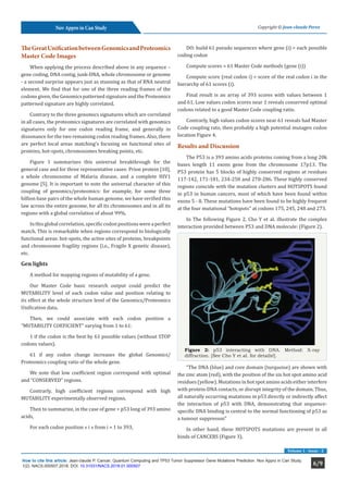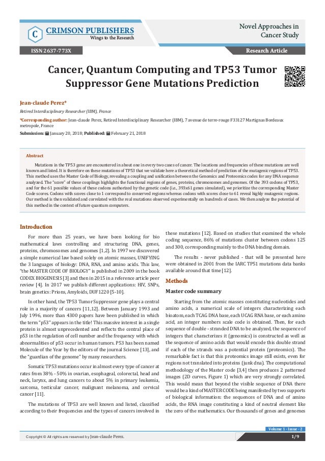 1. 1. Jean-claude Perez* Retired Interdisciplinary Researcher (IBM), France *Corresponding author: Jean-claude Perez, Retired Interdisciplinary Researcher (IBM), 7 avenue de terre-rouge F33127 Martignas Bordeaux metropole, France Submission: January 20, 2018; Published: February 21, 2018 Cancer, Quantum Computing and TP53 Tumor Suppressor Gene Mutations Prediction Introduction For more than 25 years, we have been looking for bio mathematical laws controlling and structuring DNA, genes, proteins, chromosomes and genomes [1,2]. In 1997 we discovered a simple numerical law based solely on atomic masses, UNIFYING the 3 languages of biology: DNA, RNA, and amino acids. This law, “the MASTER CODE OF BIOLOGY” is published in 2009 in the book CODEX BIOGENESIS [3] and then in 2015 in a reference article peer review [4]. In 2017 we publish different applications: HIV, SNPs, brain genetics: Prions, Amyloids, DUF1220 [5-10]. In other hand, the TP53 Tumor Suppressor gene plays a central role in a majority of cancers [11,12]. Between January 1993 and July 1996, more than 4300 papers have been published in which the term “p53” appears in the title! This massive interest in a single protein is almost unprecedented and reflects the central place of p53 in the regulation of cell number and the frequency with which abnormalities of p53 occur in human tumors. P53 has been named Molecule of the Year by the editors of the journal Science [13], and the “guardian of the genome” by many researchers. Somatic TP53 mutations occur in almost every type of cancer at rates from 38% - 50% in ovarian, esophageal, colorectal, head and neck, larynx, and lung cancers to about 5% in primary leukemia, sarcoma, testicular cancer, malignant melanoma, and cervical cancer [11]. The mutations of TP53 are well known and listed, classified according to their frequencies and the types of cancers involved in these mutations [12]. Based on studies that examined the whole coding sequence, 86% of mutations cluster between codons 125 and 300, corresponding mainly to the DNA binding domain. The results - never published - that will be presented here were obtained in 2001 from the IARC TP51 mutations data banks available around that time [12]. Methods Master code summary Starting from the atomic masses constituting nucleotides and amino acids, a numerical scale of integers characterizing each bioatom, each TCAG DNA base, each UCAG RNA base, or each amino acid, an integer numbers scale code is obtained. Then, for each sequence of double - stranded DNA to be analyzed, the sequence of integers that characterizes it (genomics) is constructed as well as the sequence of amino acids that would encode this double strand if each of the strands was a potential protein (proteomics). The remarkable fact is that this proteomics image still exists, even for regions not translated into proteins (junk dna). The computational methodology of the Master code [3,4] then produces 2 patterned images (2D curves, Figure 1) which are very strongly correlated. This would mean that beyond the visible sequence of DNA there would be a kind of MASTER CODE being manifested by two supports of biological information: the sequences of DNA and of amino acids, the RNA image constituting a kind of neutral element like the zero of the mathematics. Our thousands of genes and genomes Research Article 1/9Copyright © All rights are reserved by Jean-claude Perez. Volume 1 - Issue - 2 Abstract Mutations in the TP53 gene are encountered in about one in every two cases of cancer. The locations and frequencies of these mutations are well known and listed. It is therefore on these mutations of TP53 that we validate here a theoretical method of prediction of the mutagenic regions of TP53. This method uses the Master Code of Biology, revealing a coupling and unification between the Genomics and Proteomics codes for any DNA sequence analyzed. The “score” of these couplings highlights the functional regions of genes, proteins, chromosomes and genomes. Of the 393 codons of TP53, and for the 61 possible values of these codons authorized by the genetic code (i.e., 393x61 genes simulated), we prioritize the corresponding Master Code scores. Codons with scores close to 1 correspond to conserved regions whereas codons with scores close to 61 reveal highly mutagenic regions. Our method is then validated and correlated with the real mutations observed experimentally on hundreds of cases. We then analyze the potential of this method in the context of future quantum computers. Novel Approaches in Cancer StudyC CRIMSON PUBLISHERS Wings to the Research ISSN 2637-773X
