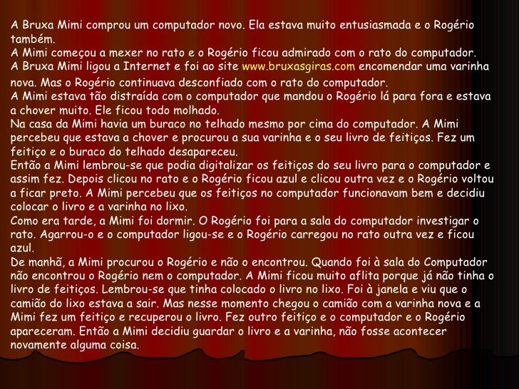 1. 2. A Bruxa Mimi comprou um computador novo. Ela estava muito entusiasmada e o Rogério também. A Mimi começou a mexer no rato e o Rogério ficou admirado com o rato do computador. A Bruxa Mimi ligou a Internet e foi ao site www.bruxasgiras.com encomendar uma varinha nova. Mas o Rogério continuava desconfiado com o rato do computador. A Mimi estava tão distraída com o computador que mandou o Rogério lá para fora e estava a chover muito. Ele ficou todo molhado. Na casa da Mimi havia um buraco no telhado mesmo por cima do computador. A Mimi percebeu que estava a chover e procurou a sua varinha e o seu livro de feitiços. Fez um feitiço e o buraco do telhado desapareceu. Então a Mimi lembrou-se que podia digitalizar os feitiços do seu livro para o computador e assim fez. Depois clicou no rato e o Rogério ficou azul e clicou outra vez e o Rogério voltou a ficar preto. A Mimi percebeu que os feitiços no computador funcionavam bem e decidiu colocar o livro e a varinha no lixo. Como era tarde, a Mimi foi dormir. O Rogério foi para a sala do computador investigar o rato. Agarrou-o e o computador ligou-se e o Rogério carregou no rato outra vez e ficou azul. De manhã, a Mimi procurou o Rogério e não o encontrou. Quando foi à sala do Computador não encontrou o Rogério nem o computador. A Mimi ficou muito aflita porque já não tinha o livro de feitiços. Lembrou-se que tinha colocado o livro no lixo. Foi à janela e viu que o camião do lixo estava a sair. Mas nesse momento chegou o camião com a varinha nova e a Mimi fez um feitiço e recuperou o livro. Fez outro feitiço e o computador e o Rogério apareceram. Então a Mimi decidiu guardar o livro e a varinha, não fosse acontecer novamente alguma coisa.