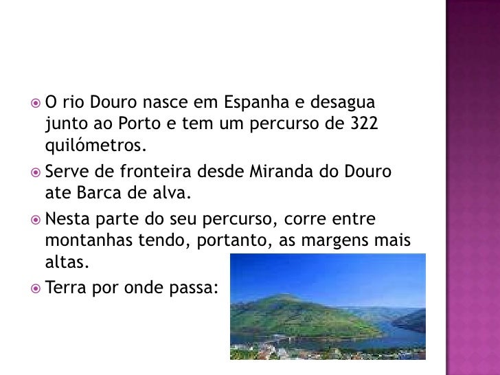 2. 2. O rio Douro nasce em Espanha e desagua junto ao Porto e tem um percurso de 322 quilómetros.<br />Serve de fronteira desde Miranda do Douro ate Barca de alva.<br />Nesta parte do seu percurso, corre entre montanhas tendo, portanto, as margens mais altas.<br />Terra por onde passa: <br />