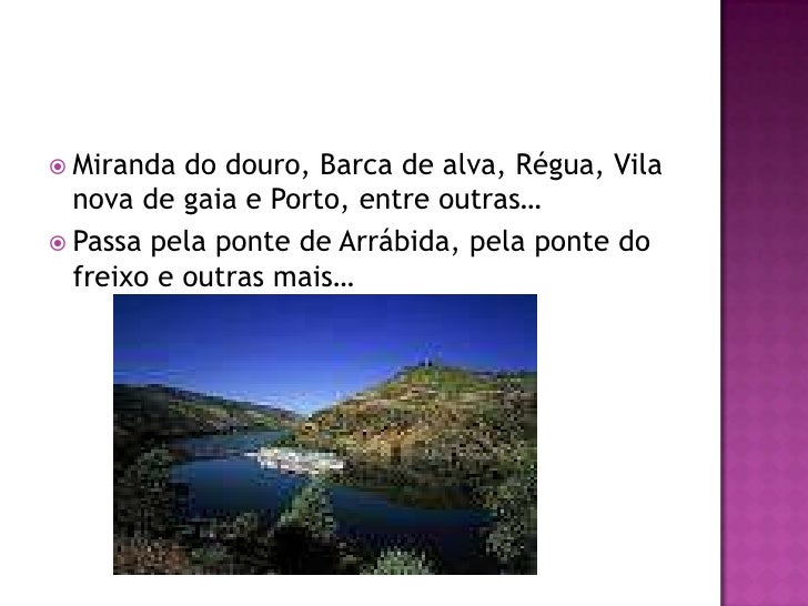 3. 3. Miranda do douro, Barca de alva, Régua, Vila nova de gaia e Porto, entre outras…<br />Passa pela ponte de Arrábida, pela ponte do freixo e outras mais…<br />