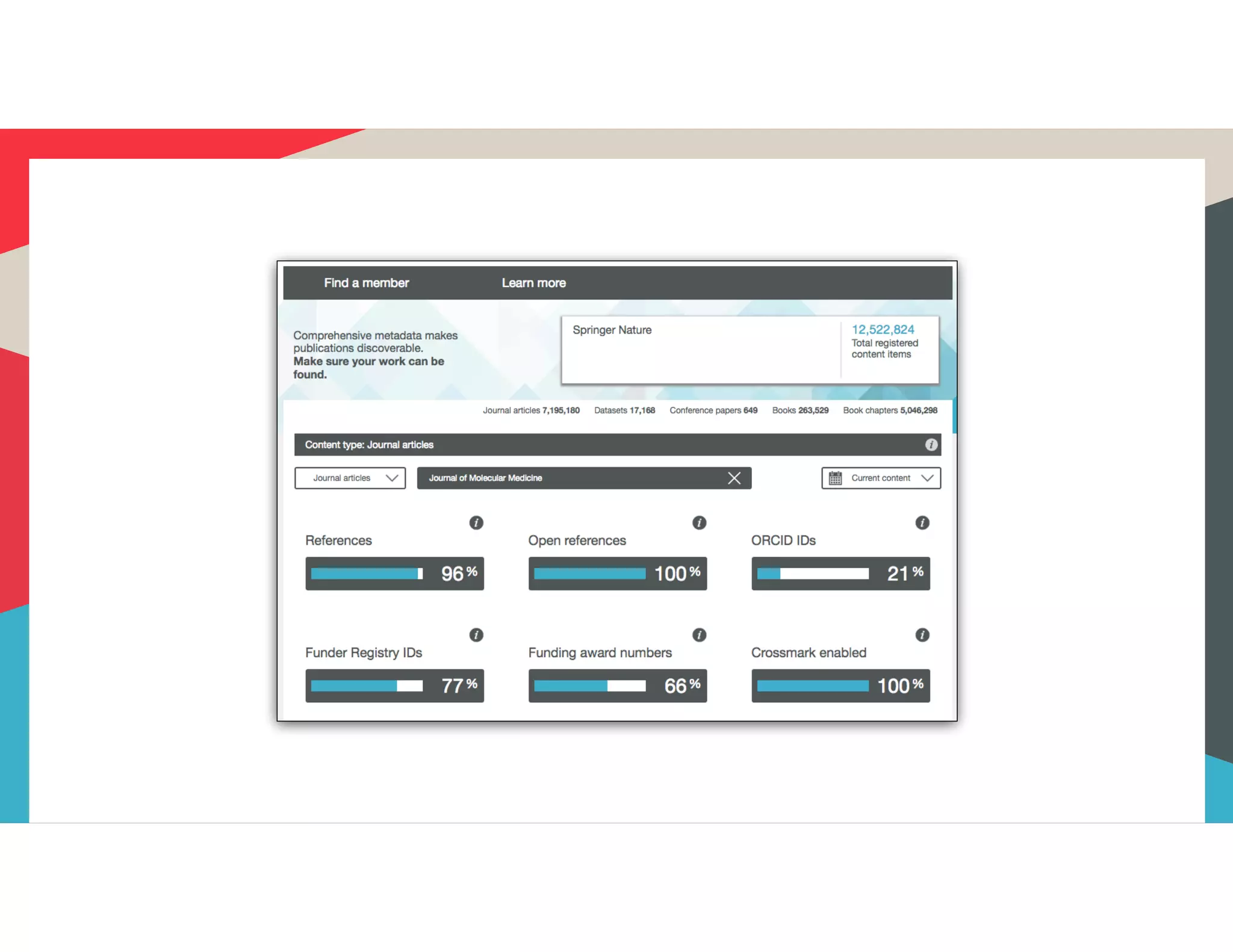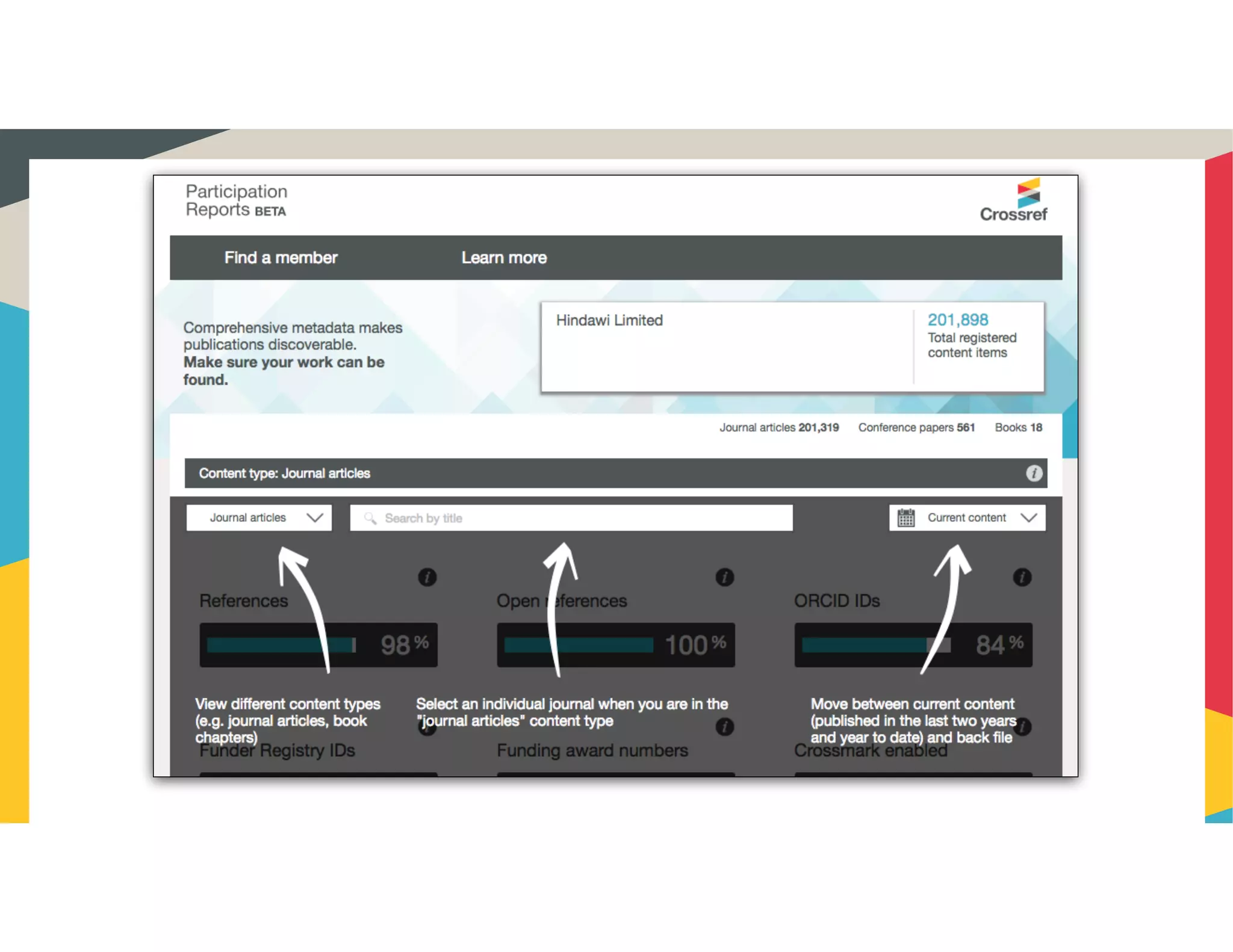 The document discusses the usage of CrossRef metadata in research, emphasizing its contribution to author profiling and tracking funding. It highlights the importance of comprehensive metadata, including titles, author details, and licensing information, for effective research management. Future plans for CrossRef include enhancing metadata quality and expanding elements available for members.