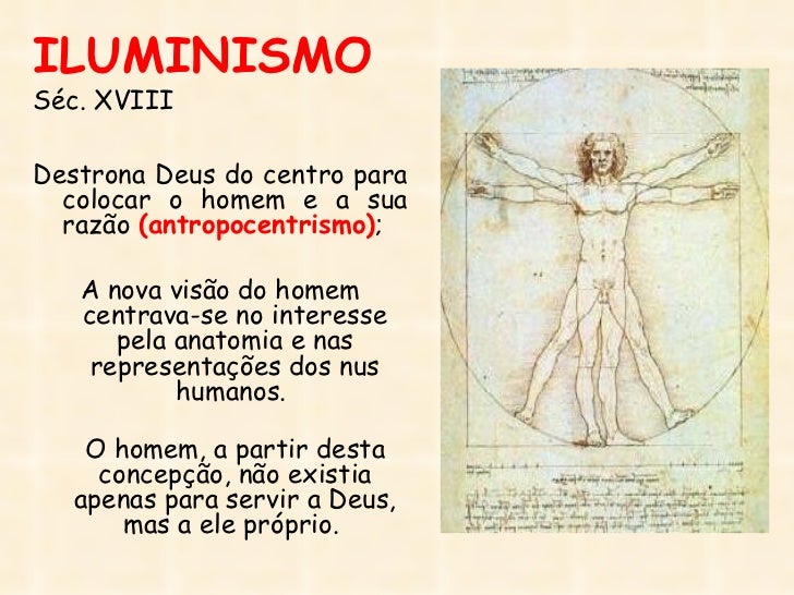 10. 10. ILUMINISMOSéc. XVIIIDestrona Deus do centro para colocar o homem e a sua razão (antropocentrismo); A nova visão do homem centrava-se no interesse pela anatomia e nas representações dos nus humanos. O homem, a partir desta concepção, não existia apenas para servir a Deus, mas a ele próprio.