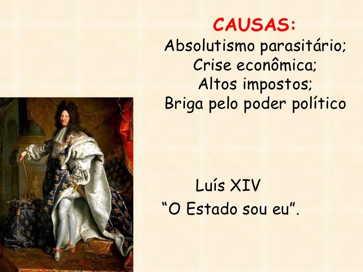 17. 17. CAUSAS:Absolutismo parasitário; Crise econômica; Altos impostos;Briga pelo poder político Luís XIV“O Estado sou eu”.