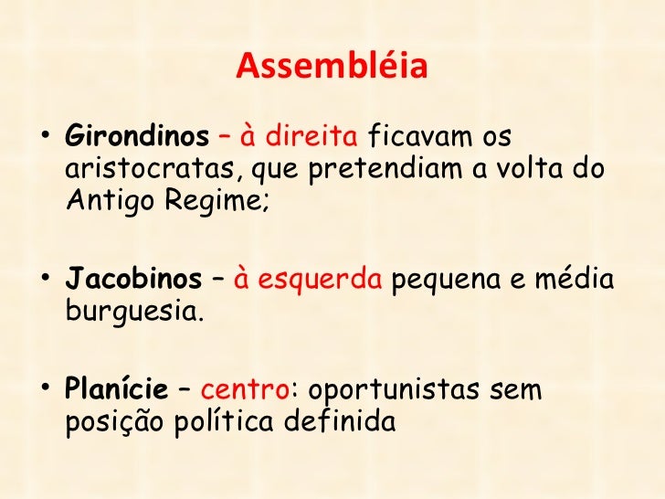 20. 20. Assembléia• Girondinos – à direita ficavam os aristocratas, que pretendiam a volta do Antigo Regime;• Jacobinos – à esquerda pequena e média burguesia.• Planície – centro: oportunistas sem posição política definida