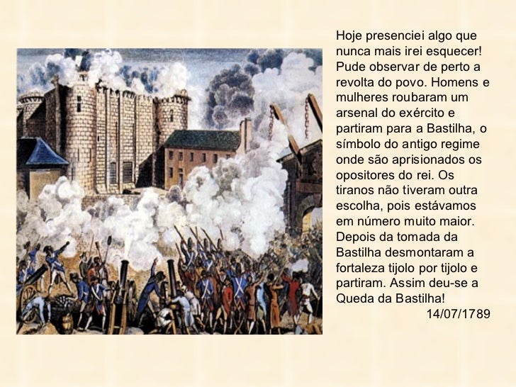 22. 22. Hoje presenciei algo quenunca mais irei esquecer!Pude observar de perto arevolta do povo. Homens emulheres roubaram umarsenal do exército epartiram para a Bastilha, osímbolo do antigo regimeonde são aprisionados osopositores do rei. Ostiranos não tiveram outraescolha, pois estávamosem número muito maior.Depois da tomada daBastilha desmontaram afortaleza tijolo por tijolo epartiram. Assim deu-se aQueda da Bastilha! 14/07/1789