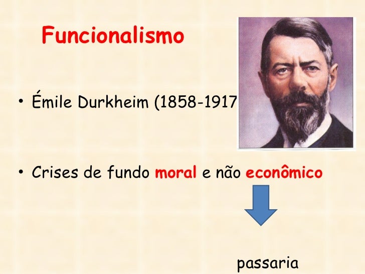 29. 29. Funcionalismo• Émile Durkheim (1858-1917)• Crises de fundo moral e não econômico passaria