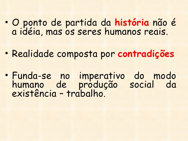 33. 33. • O ponto de partida da história não é a idéia, mas os seres humanos reais.• Realidade composta por contradições• Funda-se no imperativo do modo humano de produção social da existência – trabalho.