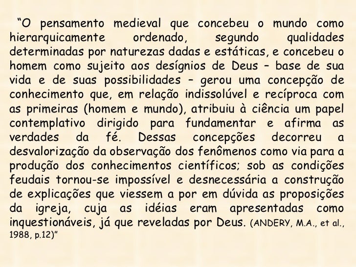 4. 4. “O pensamento medieval que concebeu o mundo comohierarquicamente ordenado, segundo qualidadesdeterminadas por naturezas dadas e estáticas, e concebeu ohomem como sujeito aos desígnios de Deus – base de suavida e de suas possibilidades – gerou uma concepção deconhecimento que, em relação indissolúvel e recíproca comas primeiras (homem e mundo), atribuiu à ciência um papelcontemplativo dirigido para fundamentar e afirma asverdades da fé. Dessas concepções decorreu adesvalorização da observação dos fenômenos como via para aprodução dos conhecimentos científicos; sob as condiçõesfeudais tornou-se impossível e desnecessária a construçãode explicações que viessem a por em dúvida as proposiçõesda igreja, cuja as idéias eram apresentadas comoinquestionáveis, já que reveladas por Deus. (ANDERY, M.A., et al.,1988, p.12)”