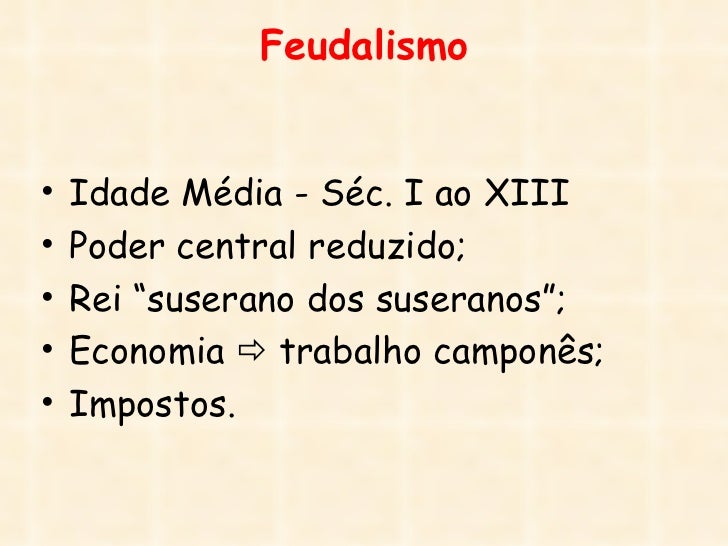 5. 5. Feudalismo• Idade Média - Séc. I ao XIII• Poder central reduzido;• Rei “suserano dos suseranos”;• Economia  trabalho camponês;• Impostos.