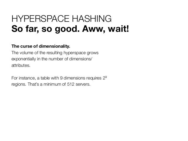 9. 9. HYPERSPACE HASHING So far, so good. Aww, wait! The curse of dimensionality. The volume of the resulting hyperspace grows exponentially in the number of dimensions/ attributes. For instance, a table with 9 dimensions requires 29 regions. That’s a minimum of 512 servers.