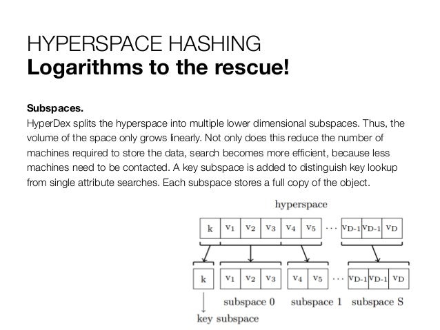 10. 10. HYPERSPACE HASHING Logarithms to the rescue! Subspaces. HyperDex splits the hyperspace into multiple lower dimensional subspaces. Thus, the volume of the space only grows linearly. Not only does this reduce the number of machines required to store the data, search becomes more efficient, because less machines need to be contacted. A key subspace is added to distinguish key lookup from single attribute searches. Each subspace stores a full copy of the object.