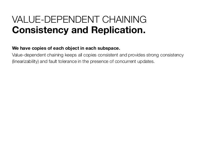 12. 12. VALUE-DEPENDENT CHAINING Consistency and Replication. We have copies of each object in each subspace. Value-dependent chaining keeps all copies consistent and provides strong consistency (linearizability) and fault tolerance in the presence of concurrent updates.