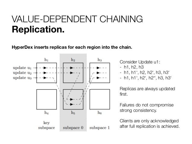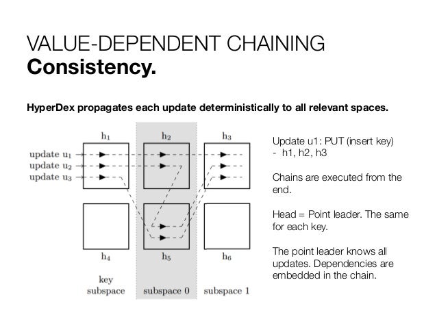 13. 13. VALUE-DEPENDENT CHAINING Consistency. HyperDex propagates each update deterministically to all relevant spaces. Update u1: PUT (insert key) -  h1, h2, h3 Chains are executed from the end. Head = Point leader. The same for each key. The point leader knows all updates. Dependencies are embedded in the chain.