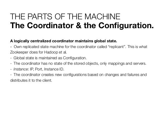17. 17. THE PARTS OF THE MACHINE The Coordinator & the Configuration. A logically centralized coordinator maintains global state. -  Own replicated state machine for the coordinator called “replicant”. This is what Zookeeper does for Hadoop et al. -  Global state is maintained as Configuration. -  The coordinator has no state of the stored objects, only mappings and servers. -  Instance: IP, Port, Instance ID. -  The coordinator creates new configurations based on changes and failures and distributes it to the client.