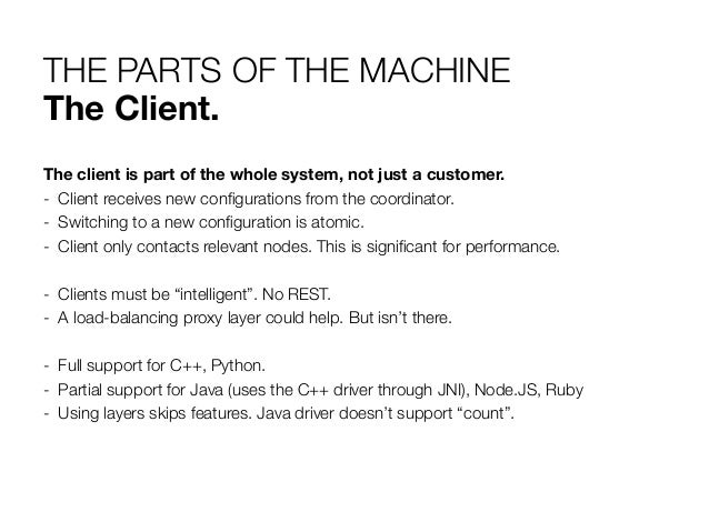 18. 18. THE PARTS OF THE MACHINE The Client. The client is part of the whole system, not just a customer. -  Client receives new configurations from the coordinator. -  Switching to a new configuration is atomic. -  Client only contacts relevant nodes. This is significant for performance. -  Clients must be “intelligent”. No REST. -  A load-balancing proxy layer could help. But isn’t there. -  Full support for C++, Python. -  Partial support for Java (uses the C++ driver through JNI), Node.JS, Ruby -  Using layers skips features. Java driver doesn’t support “count”.