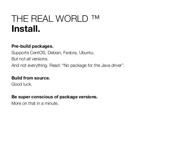 20. 20. THE REAL WORLD ™ Install. Pre-build packages. Supports CentOS, Debian, Fedora, Ubuntu. But not all versions. And not everything. Read: “No package for the Java driver”. Build from source. Good luck. Be super conscious of package versions. More on that in a minute.