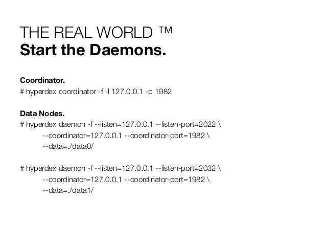 21. 21. THE REAL WORLD ™ Start the Daemons. Coordinator. # hyperdex coordinator -f -l 127.0.0.1 -p 1982 Data Nodes. # hyperdex daemon -f --listen=127.0.0.1 --listen-port=2022 --coordinator=127.0.0.1 --coordinator-port=1982 --data=./data0/ # hyperdex daemon -f --listen=127.0.0.1 --listen-port=2032 --coordinator=127.0.0.1 --coordinator-port=1982 --data=./data1/