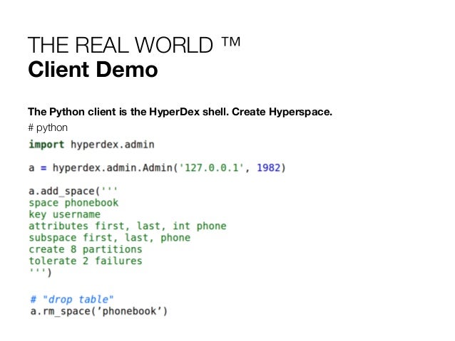 22. 22. THE REAL WORLD ™ Client Demo The Python client is the HyperDex shell. Create Hyperspace. # python