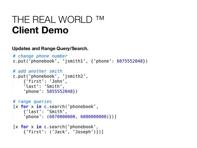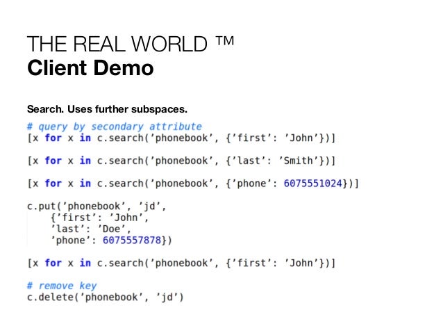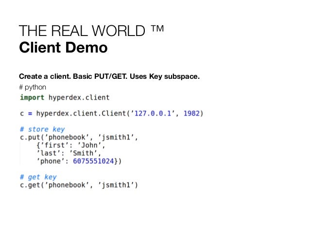 23. 23. THE REAL WORLD ™ Client Demo Create a client. Basic PUT/GET. Uses Key subspace. # python