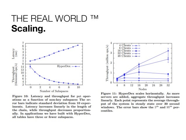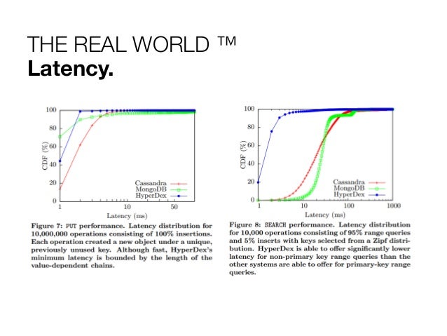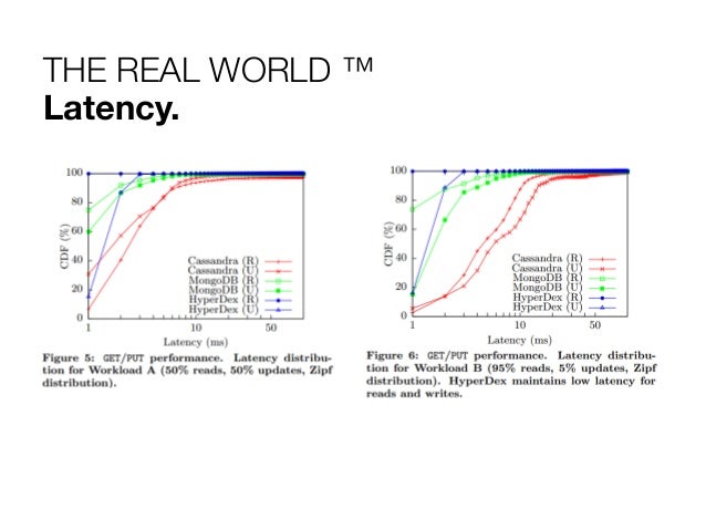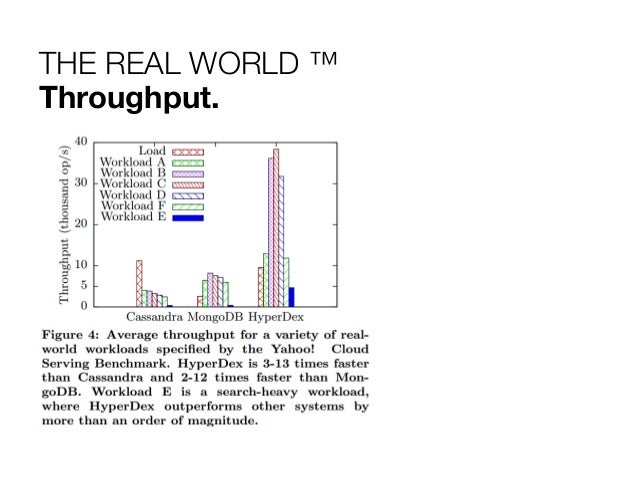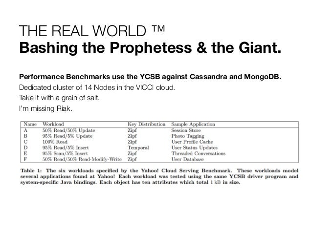 27. 27. THE REAL WORLD ™ Bashing the Prophetess & the Giant. Performance Benchmarks use the YCSB against Cassandra and MongoDB. Dedicated cluster of 14 Nodes in the VICCI cloud. Take it with a grain of salt. I’m missing Riak.