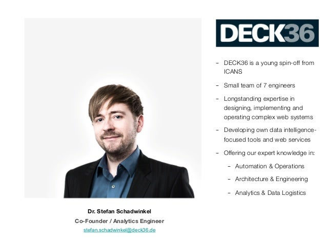 2. 2. –  DECK36 is a young spin-off from ICANS –  Small team of 7 engineers –  Longstanding expertise in designing, implementing and operating complex web systems –  Developing own data intelligencefocused tools and web services –  Offering our expert knowledge in: –  Automation & Operations –  Architecture & Engineering –  Analytics & Data Logistics Dr. Stefan Schadwinkel Co-Founder / Analytics Engineer stefan.schadwinkel@deck36.de