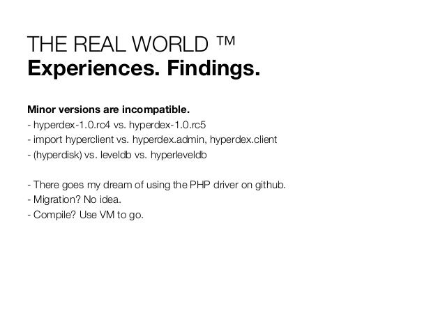 33. 33. THE REAL WORLD ™ Experiences. Findings. Minor versions are incompatible. -  hyperdex-1.0.rc4 vs. hyperdex-1.0.rc5 -  import hyperclient vs. hyperdex.admin, hyperdex.client -  (hyperdisk) vs. leveldb vs. hyperleveldb -  There goes my dream of using the PHP driver on github. -  Migration? No idea. -  Compile? Use VM to go.