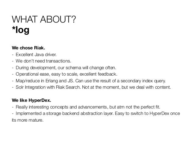 36. 36. WHAT ABOUT? *log We chose Riak. -  Excellent Java driver. -  We don’t need transactions. -  During development, our schema will change often. -  Operational ease, easy to scale, excellent feedback. -  Map/reduce in Erlang and JS. Can use the result of a secondary index query. -  Solr Integration with Riak Search. Not at the moment, but we deal with content. We like HyperDex. -  Really interesting concepts and advancements, but atm not the perfect fit. -  Implemented a storage backend abstraction layer. Easy to switch to HyperDex once its more mature.