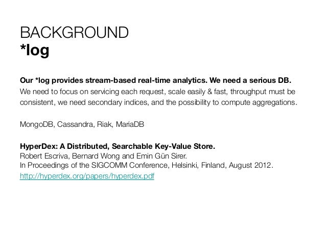 4. 4. BACKGROUND *log Our *log provides stream-based real-time analytics. We need a serious DB. We need to focus on servicing each request, scale easily & fast, throughput must be consistent, we need secondary indices, and the possibility to compute aggregations. MongoDB, Cassandra, Riak, MariaDB HyperDex: A Distributed, Searchable Key-Value Store. Robert Escriva, Bernard Wong and Emin Gün Sirer. In Proceedings of the SIGCOMM Conference, Helsinki, Finland, August 2012. http://hyperdex.org/papers/hyperdex.pdf