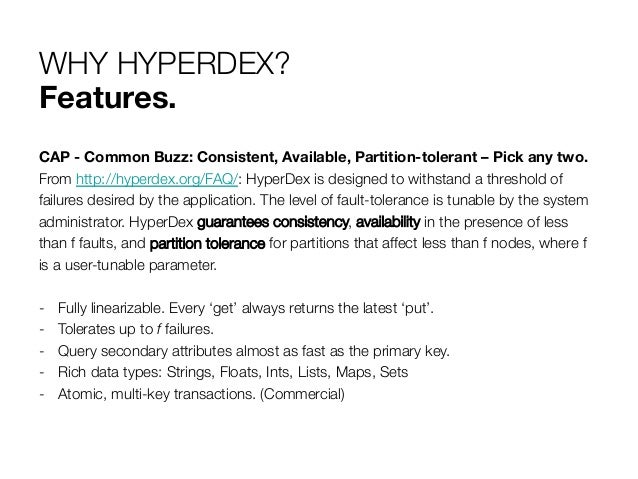 6. 6. WHY HYPERDEX? Features. CAP - Common Buzz: Consistent, Available, Partition-tolerant – Pick any two. From http://hyperdex.org/FAQ/: HyperDex is designed to withstand a threshold of failures desired by the application. The level of fault-tolerance is tunable by the system administrator. HyperDex guarantees consistency, availability in the presence of less than f faults, and partition tolerance for partitions that affect less than f nodes, where f is a user-tunable parameter. -  Fully linearizable. Every ‘get’ always returns the latest ‘put’. -  Tolerates up to f failures. -  Query secondary attributes almost as fast as the primary key. -  Rich data types: Strings, Floats, Ints, Lists, Maps, Sets -  Atomic, multi-key transactions. (Commercial)