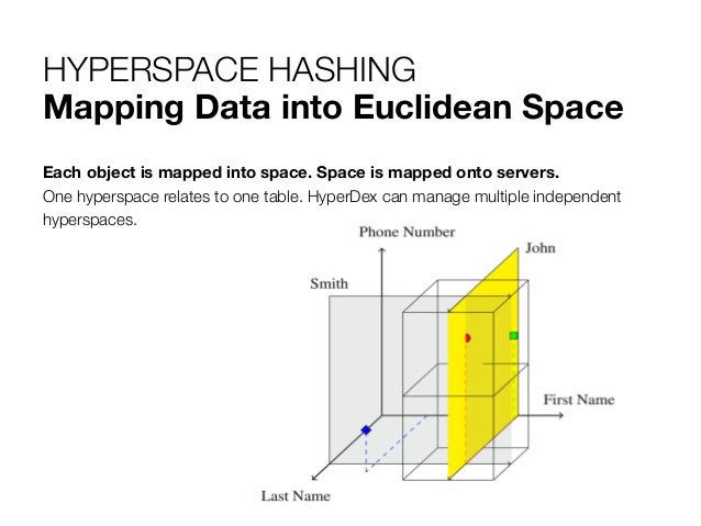 8. 8. HYPERSPACE HASHING Mapping Data into Euclidean Space Each object is mapped into space. Space is mapped onto servers. One hyperspace relates to one table. HyperDex can manage multiple independent hyperspaces.