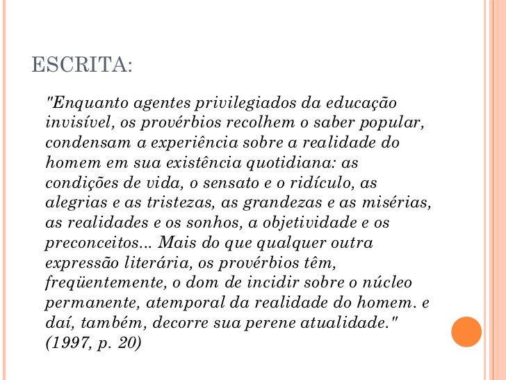 19. 30. ESCRITA: <ul><li>&quot;Enquanto agentes privilegiados da educação invisível, os provérbios recolhem o saber popular, condensam a experiência sobre a realidade do homem em sua existência quotidiana: as condições de vida, o sensato e o ridículo, as alegrias e as tristezas, as grandezas e as misérias, as realidades e os sonhos, a objetividade e os preconceitos... Mais do que qualquer outra expressão literária, os provérbios têm, freqüentemente, o dom de incidir sobre o núcleo permanente, atemporal da realidade do homem. e daí, também, decorre sua perene atualidade.&quot; (1997, p. 20) </li></ul>