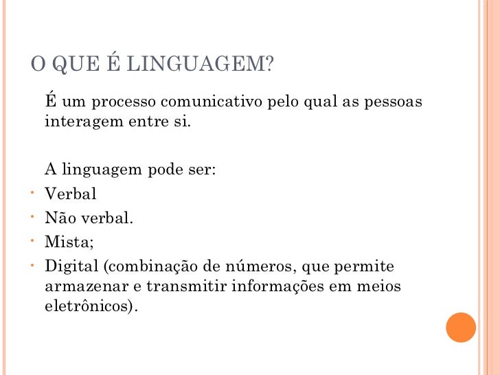 4. 4. O QUE É LINGUAGEM? <ul><li>É um processo comunicativo pelo qual as pessoas interagem entre si. </li></ul><ul><li>A linguagem pode ser: </li></ul><ul><li>Verbal </li></ul><ul><li>Não verbal. </li></ul><ul><li>Mista; </li></ul><ul><li>Digital (combinação de números, que permite armazenar e transmitir informações em meios eletrônicos). </li></ul>