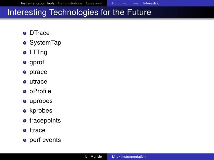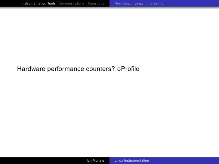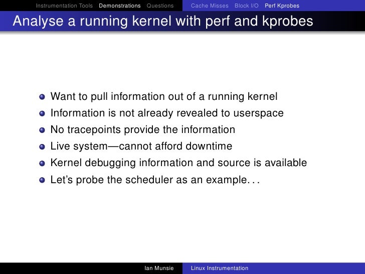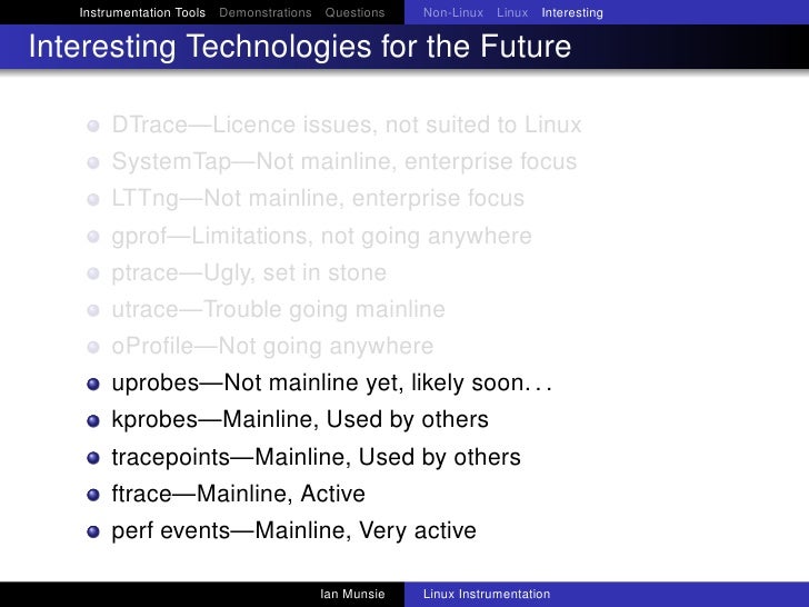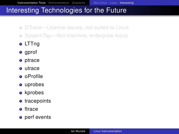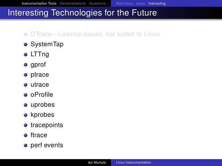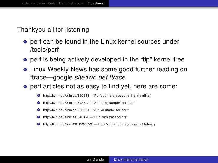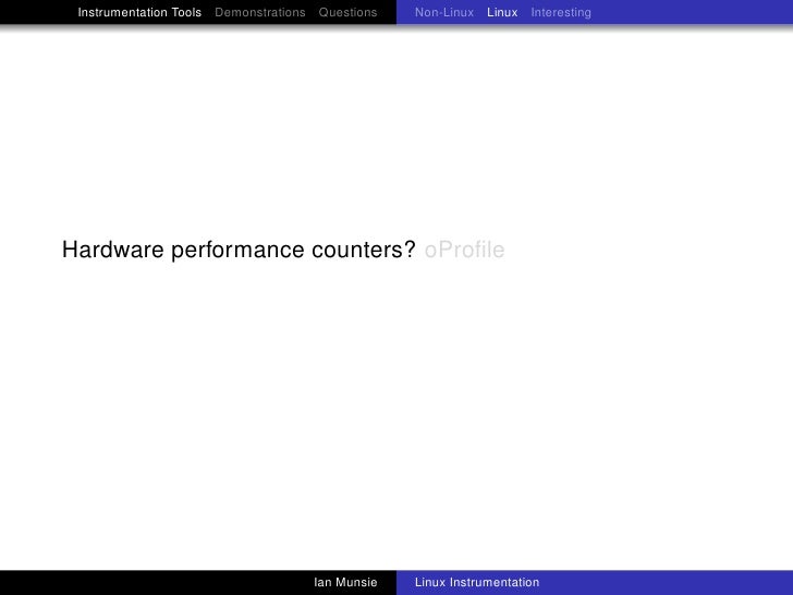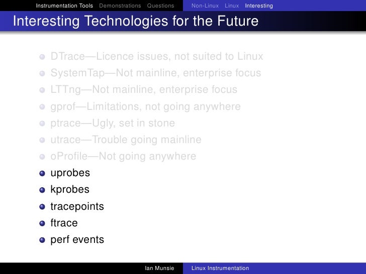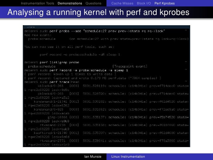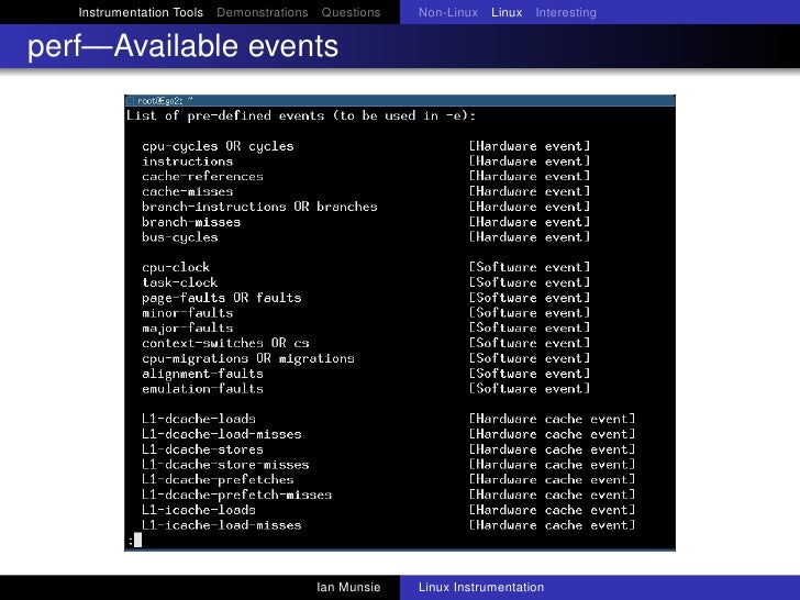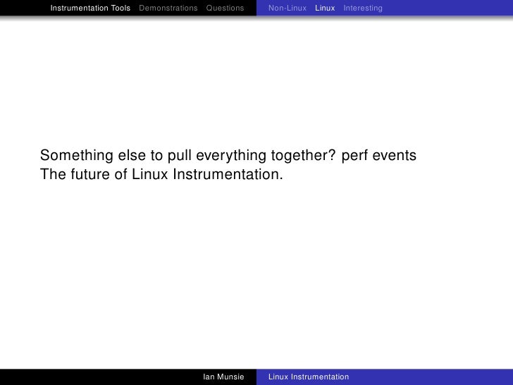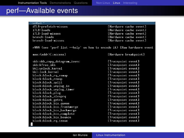 This presentation provides an overview of a number of the more noteworthy instrumentation tools available for Linux and the technologies that they build upon. Some examples of using perf events to analyse a running system to help track down real world performance problems are demonstrated.