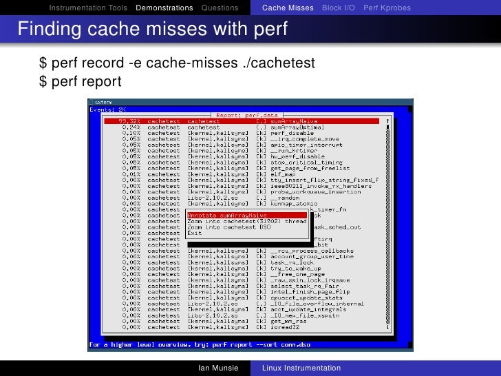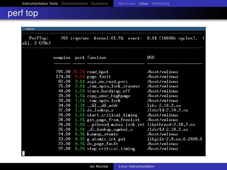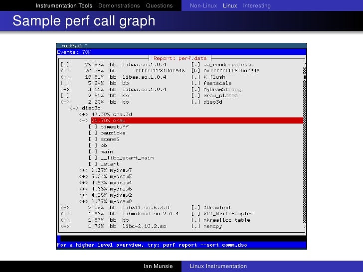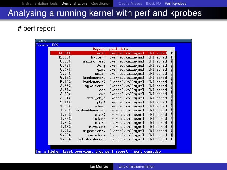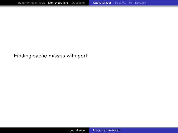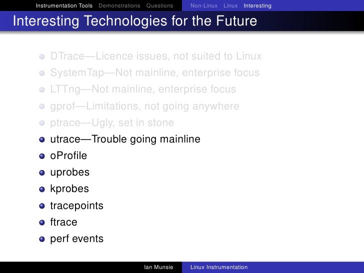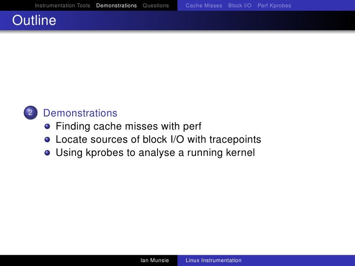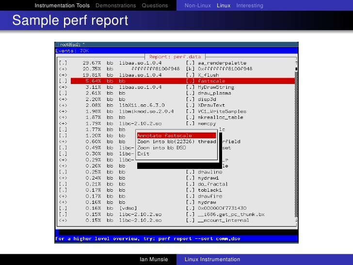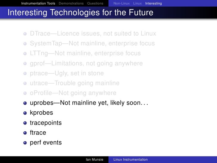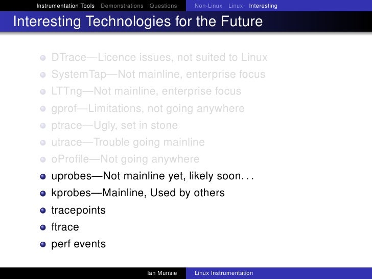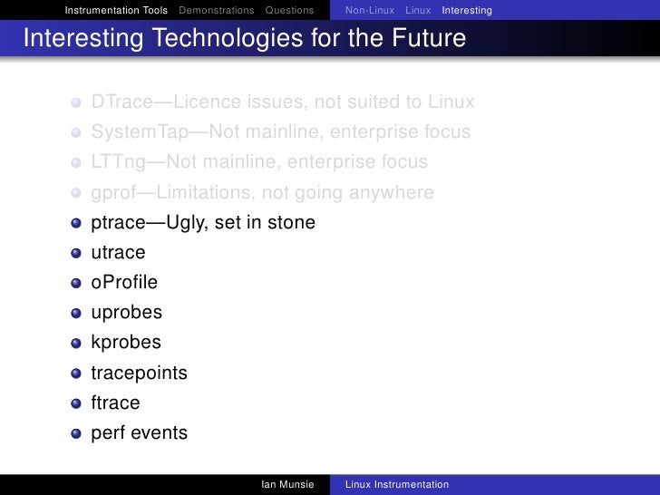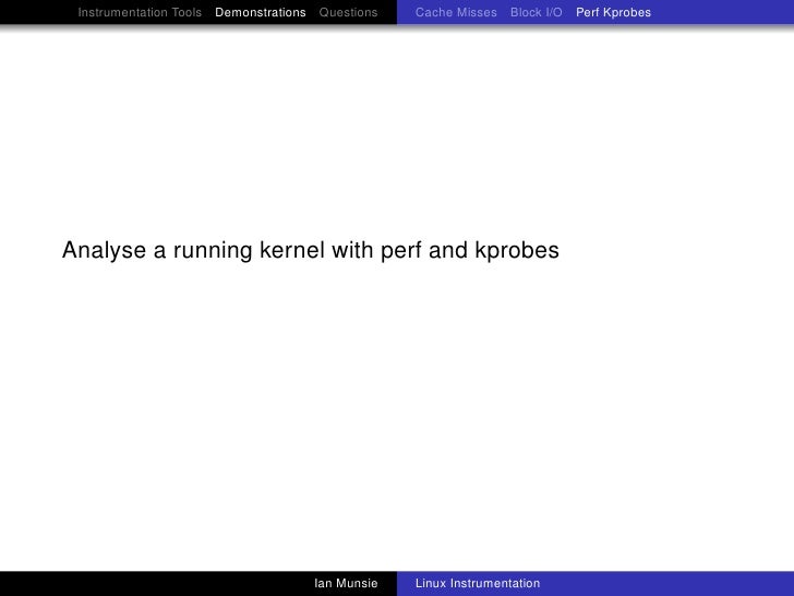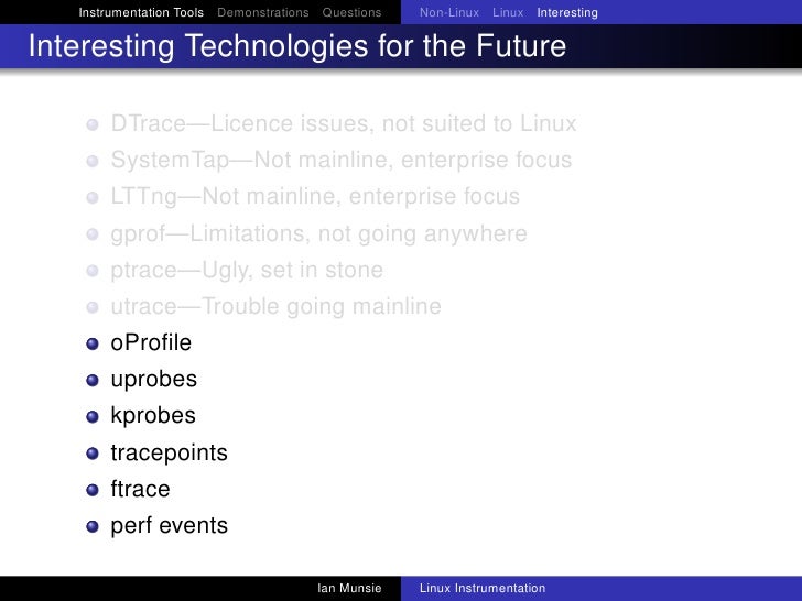 This presentation provides an overview of a number of the more noteworthy instrumentation tools available for Linux and the technologies that they build upon. Some examples of using perf events to analyse a running system to help track down real world performance problems are demonstrated.
