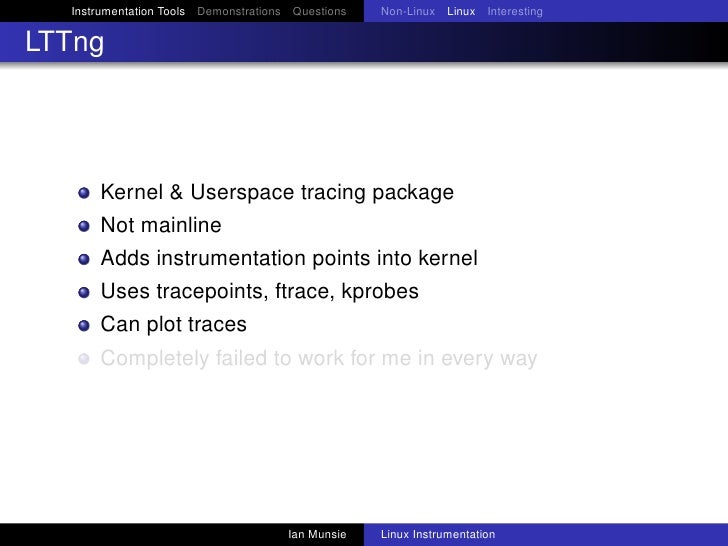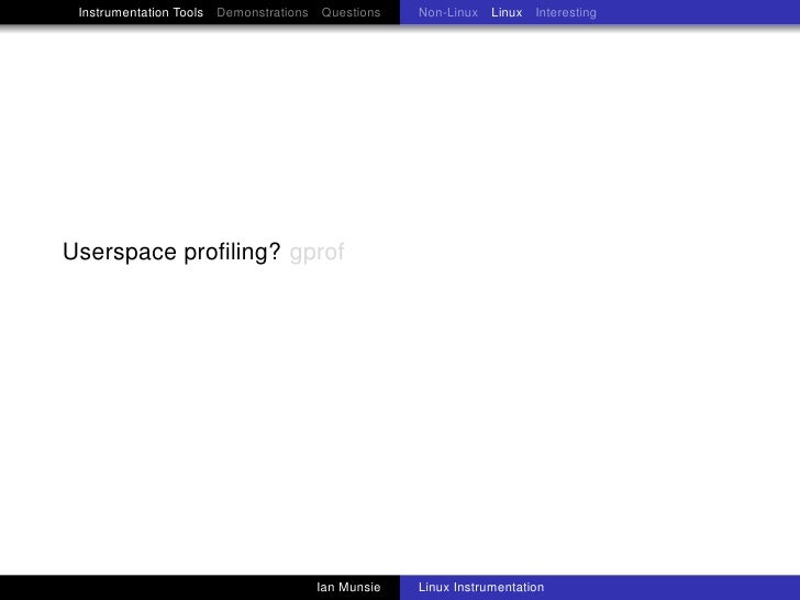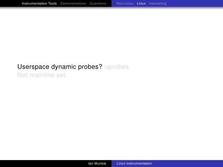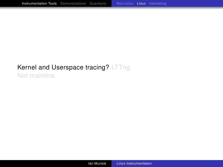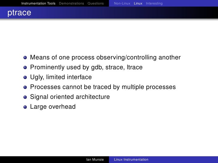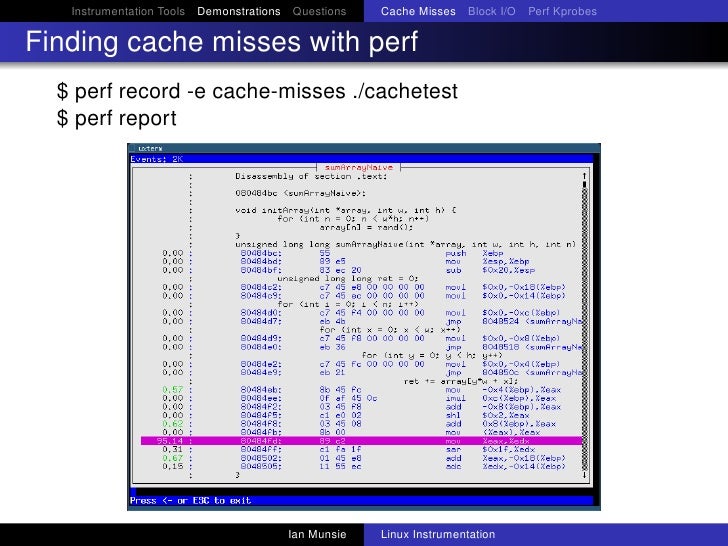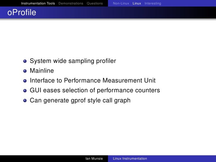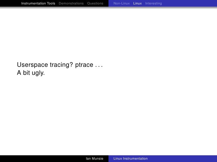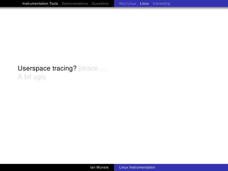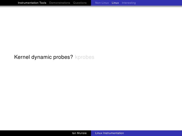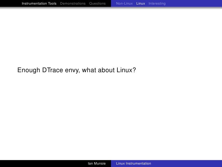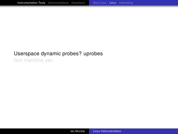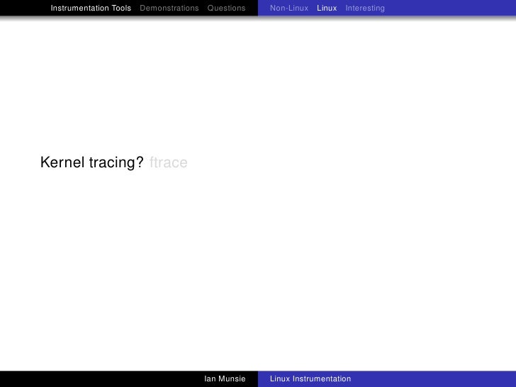 This presentation provides an overview of a number of the more noteworthy instrumentation tools available for Linux and the technologies that they build upon. Some examples of using perf events to analyse a running system to help track down real world performance problems are demonstrated.