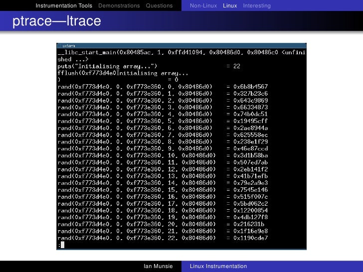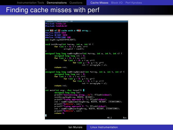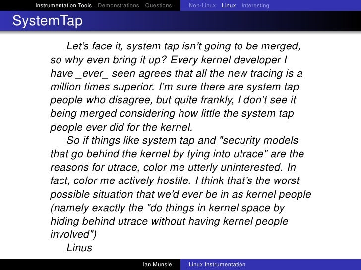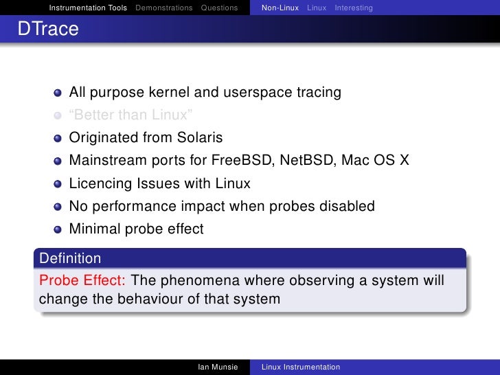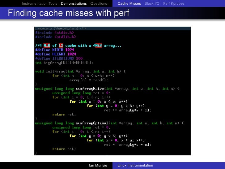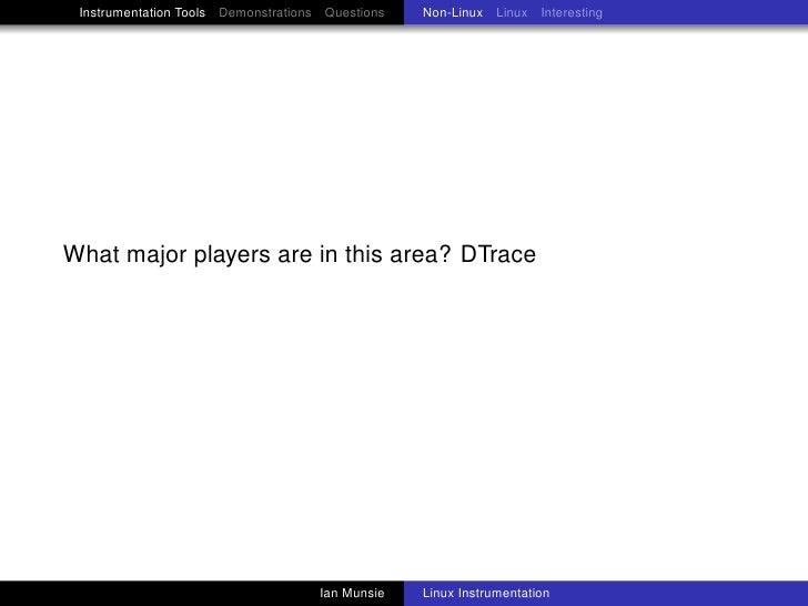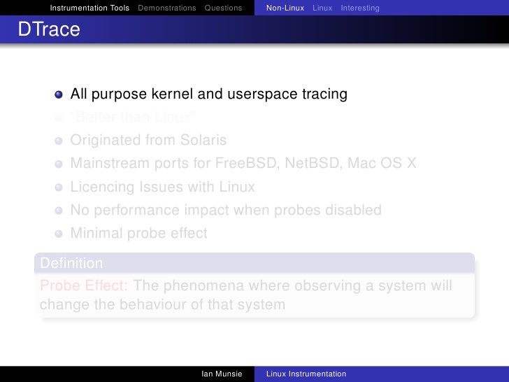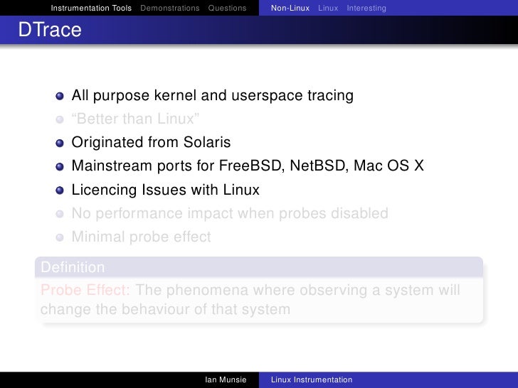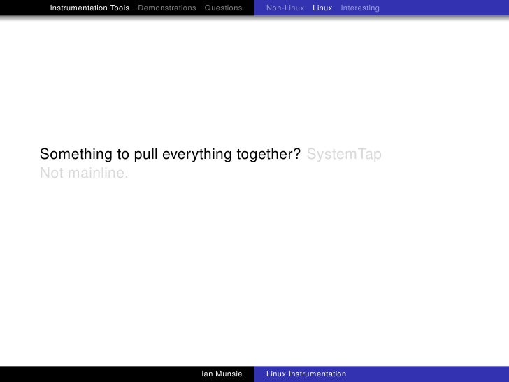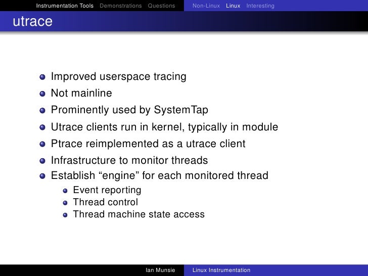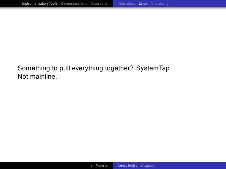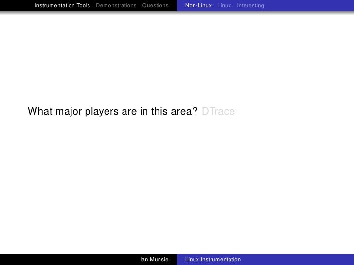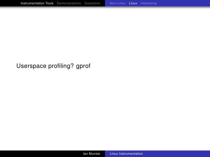 This presentation provides an overview of a number of the more noteworthy instrumentation tools available for Linux and the technologies that they build upon. Some examples of using perf events to analyse a running system to help track down real world performance problems are demonstrated.